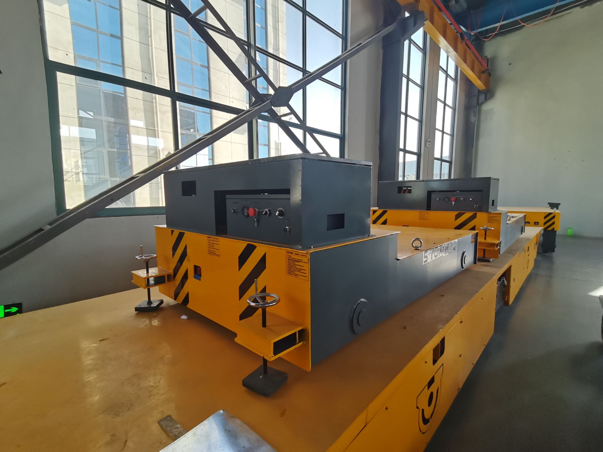 鋰電池供電,遙控器控制,軌道車(chē),聲光報(bào)警,配有智能充電機(jī),方便操作的搬運(yùn)車(chē)。