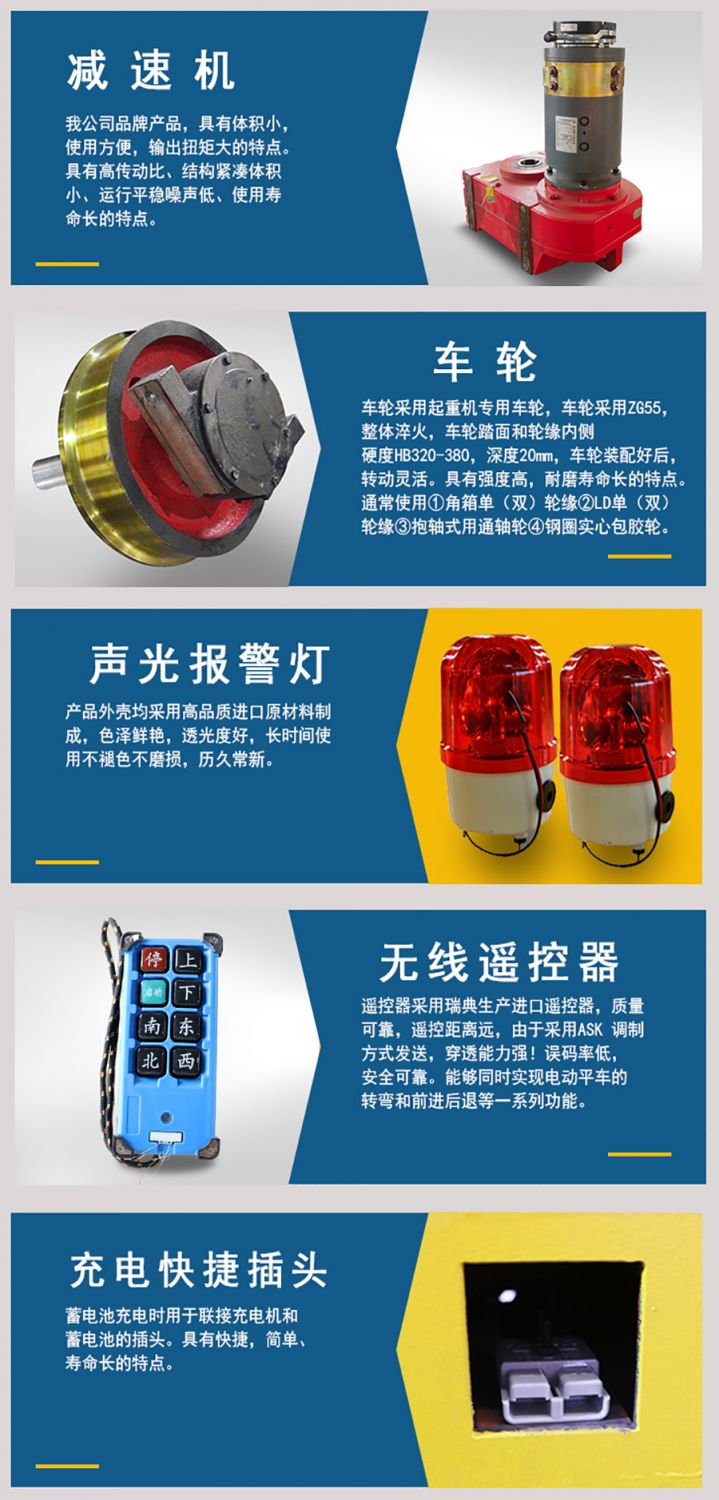 主要配置:車(chē)架、電機(jī)、減速機(jī)、車(chē)輪、蓄電池、充電機(jī)、控制箱等